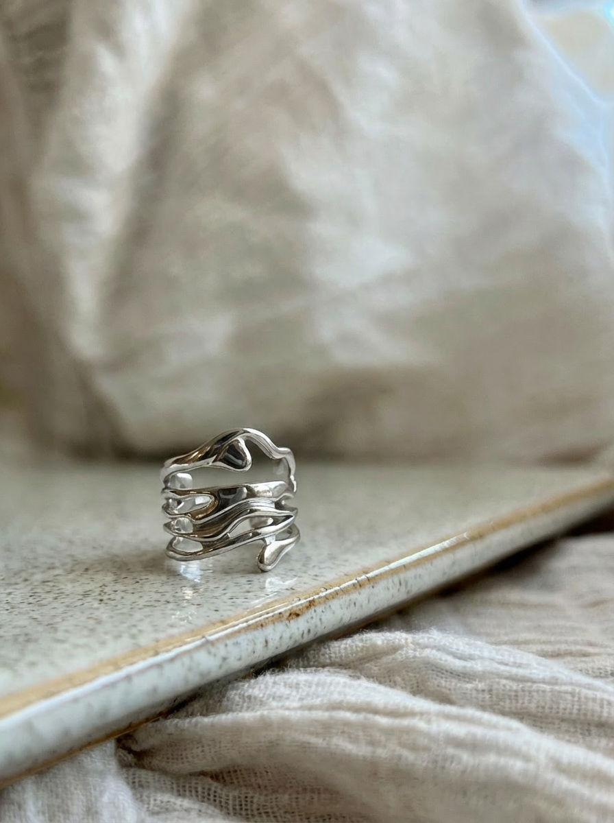 Deze sculpturale zilverkleurige ring is een echte eyecatcher. Het organische design bestaat uit meerdere vloeiende lijnen die samenkomen in een speelse, gelaagde vorm. De ring voelt modern en artistiek aan, maar blijft tegelijkertijd tijdloos en draagbaar.